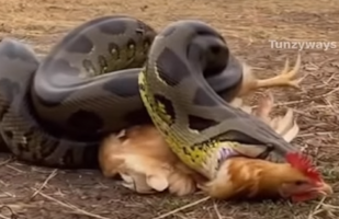 [Snake Eats Chicken] Lady brains snake with baseball bat. Chicken confused. Lady happy. Snake not. Video |