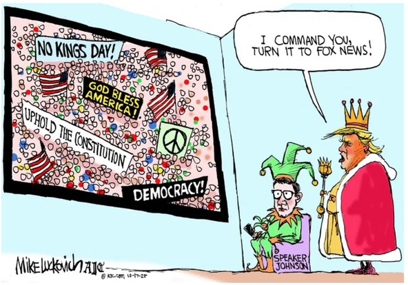 | House Speaker Mike Johnson took a break from doing nothing to solve the government shutdown to offer these keen insights into tomorrow’s No Kings Day rallies across America: “We call it the ‘Hate America Rally’,” he said. “Let’s see who shows up for that. I bet you see pro-Hamas supporters, I bet you see Antifa-types, I bet you see the Marxists in full display. The people who don’t want to stand and defend the foundational truths of this republic.” Other Republicans, following carefully scripted GOP talking points, like to refer to it as an event sponsored by the “terrorist wing” of the Democratic Party. |